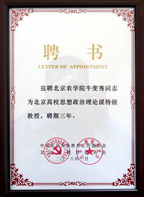 日前,北京市教工委发布第二批北京高校思想政治理论课特级教授聘书,太阳集团tcy8722牛变秀教授获聘北京高校思想政治理论课特级教授,聘期三年。