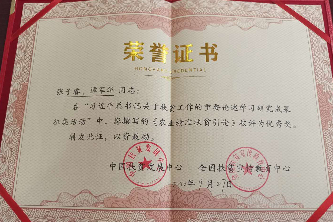 近日,国务院扶贫开发领导小组办公室直属单位中国扶贫发展中心、全国扶贫宣传教育中心,公布了“习近平总书记关于扶贫工作的重要论述学习研究成果征集活动”评选结果。公司太阳集团tcy8722副教授张子睿老师撰写的《农业精准扶贫引论》一书被评为优秀奖。