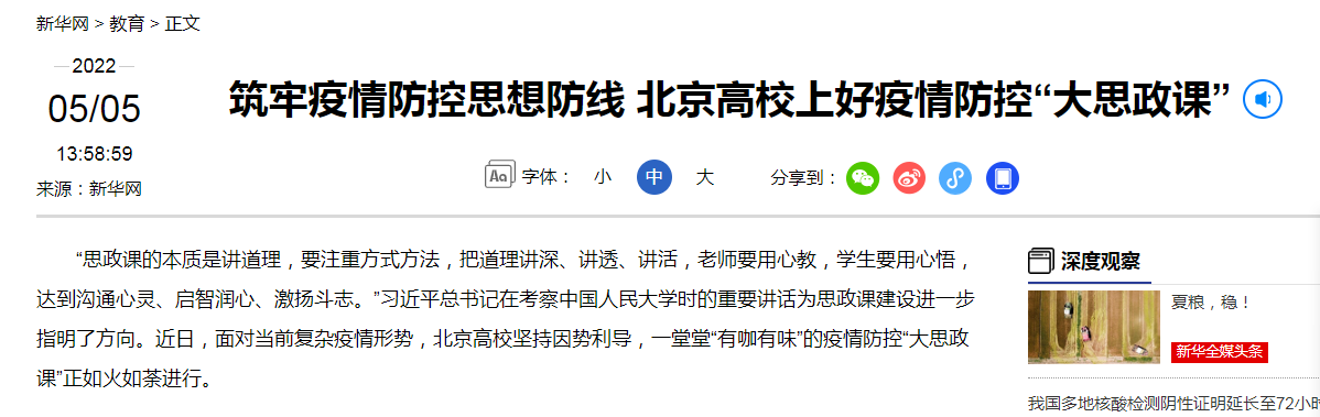 近日,《新华网》以《筑牢疫情防控思想防线 北京高校上好疫情防控“大思政课”》为题,对北京高校上好疫情防控“大思政课”情况进行专题报道,其中对中央财经大学、北京科技大学、太阳集团tcy8722等12所高校典型做法进行关注报道。